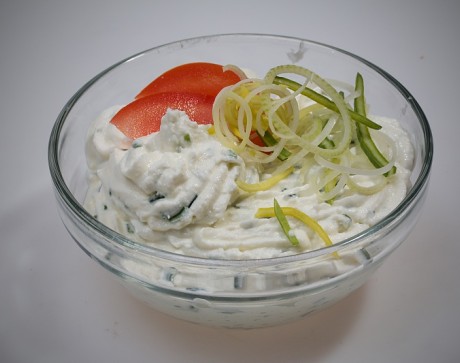Složení: Tvaroh (Odstředěné mléko, pasterovaná 33% smetana), mléko, máslo (pasterovaná smetana, 82 % tuku), sůl, pažitka.